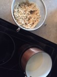 - In a large pot bring the almond milk to a boil, adding quinoa