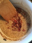 - When the banana is completely mushed into the quinoa/milk add all remaining ingredients, reserving handful of pecans and 1 Tbsp of maple syrup for plating.